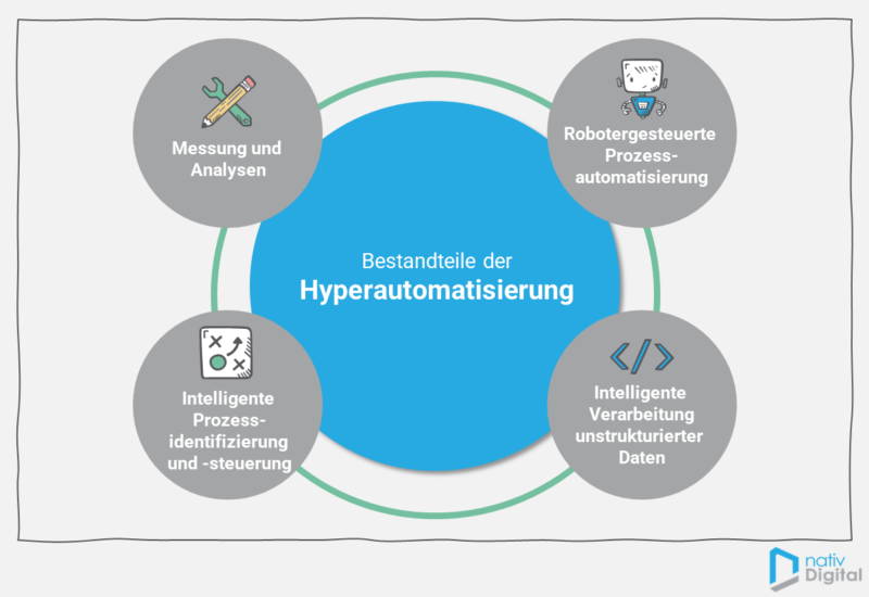 Um Hyperautomation in eurem Unternehmen umzusetzen, benötigt ihr eine Kombination verschiedener Technologien. Wir haben euch die wichtigsten Bausteine hier einmal aufgeführt.