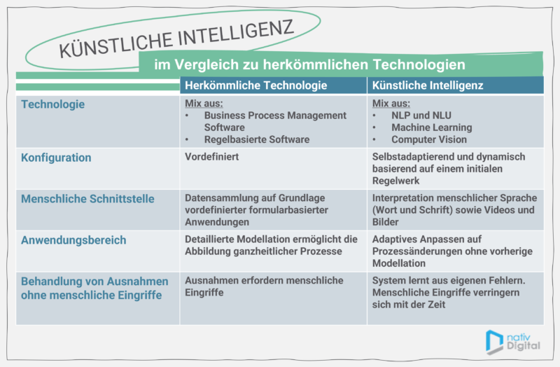 Klassische Programmierung ist klar regelbasiert. Sie reagiert immer gleich auf bestimmten Input und kennt Operationen wie: „Wenn dies eintritt, dann tu das“ oder „Tu solange dies, bis das eintritt“. In der Künstlichen Intelligenz hingegen wird ein Algorithmus geschrieben, der über diese einfachen Operationen hinaus selbstständig komplexere Muster erkennt und die notwendigen Maßnahmen ableitet.